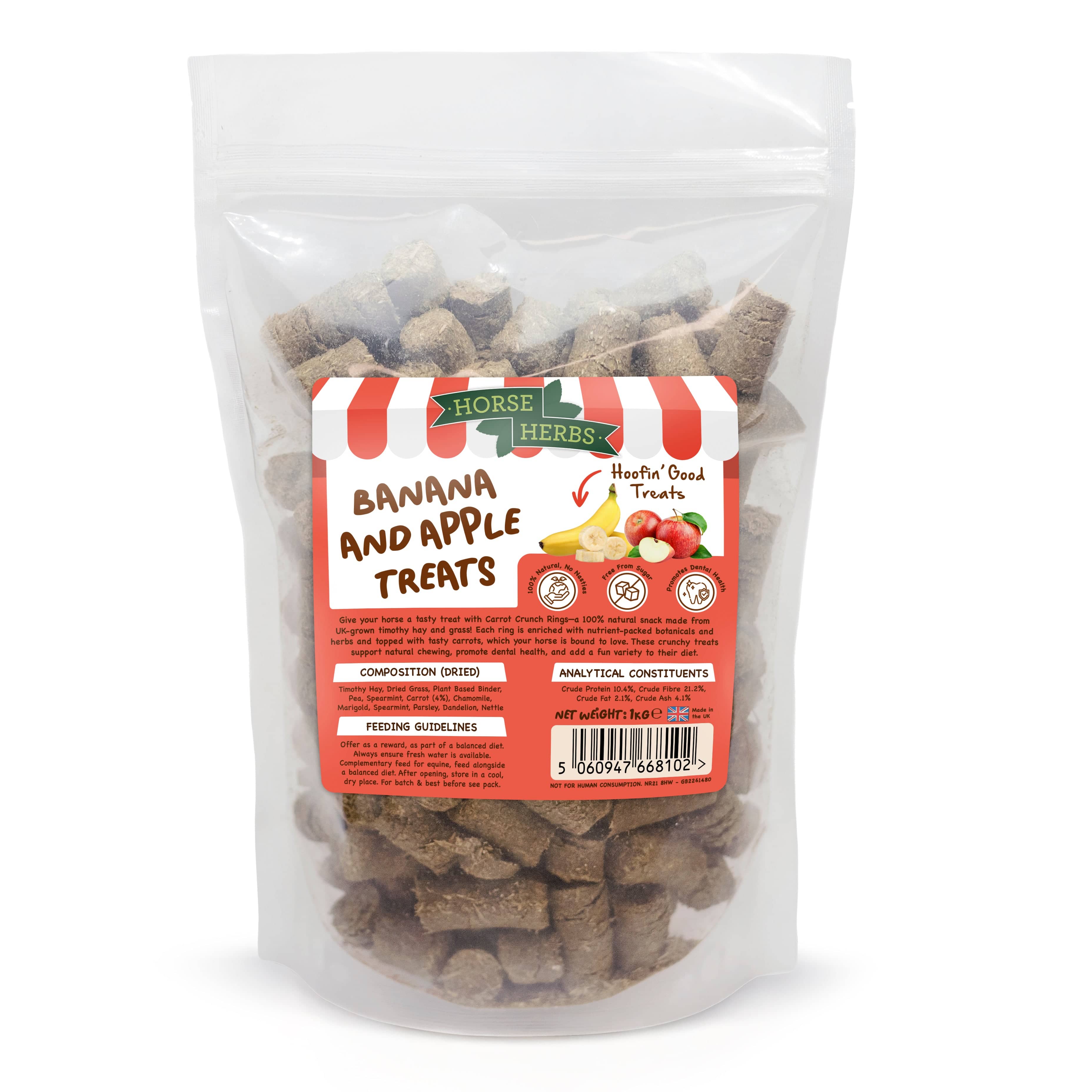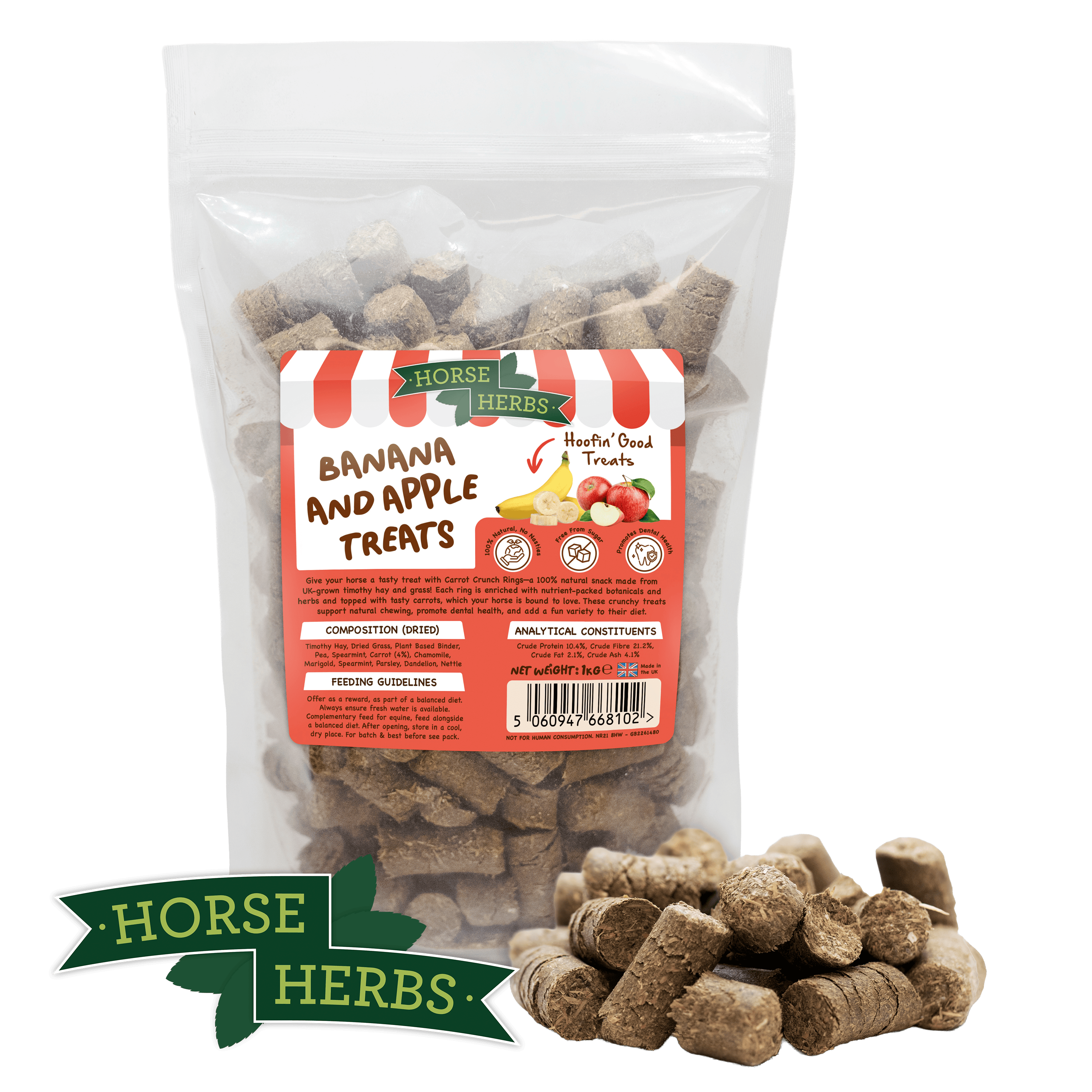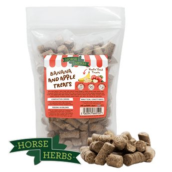 Treat your horse to our Banana & Apple Treats – a 100% natural snack they’re sure to enjoy. Highly palatable and great for encouraging natural chewing, they add a little extra variety to the daily routine. With no added sugar, flavours or additives, these fibre-rich treats make a wholesome reward for horses of all ages.
