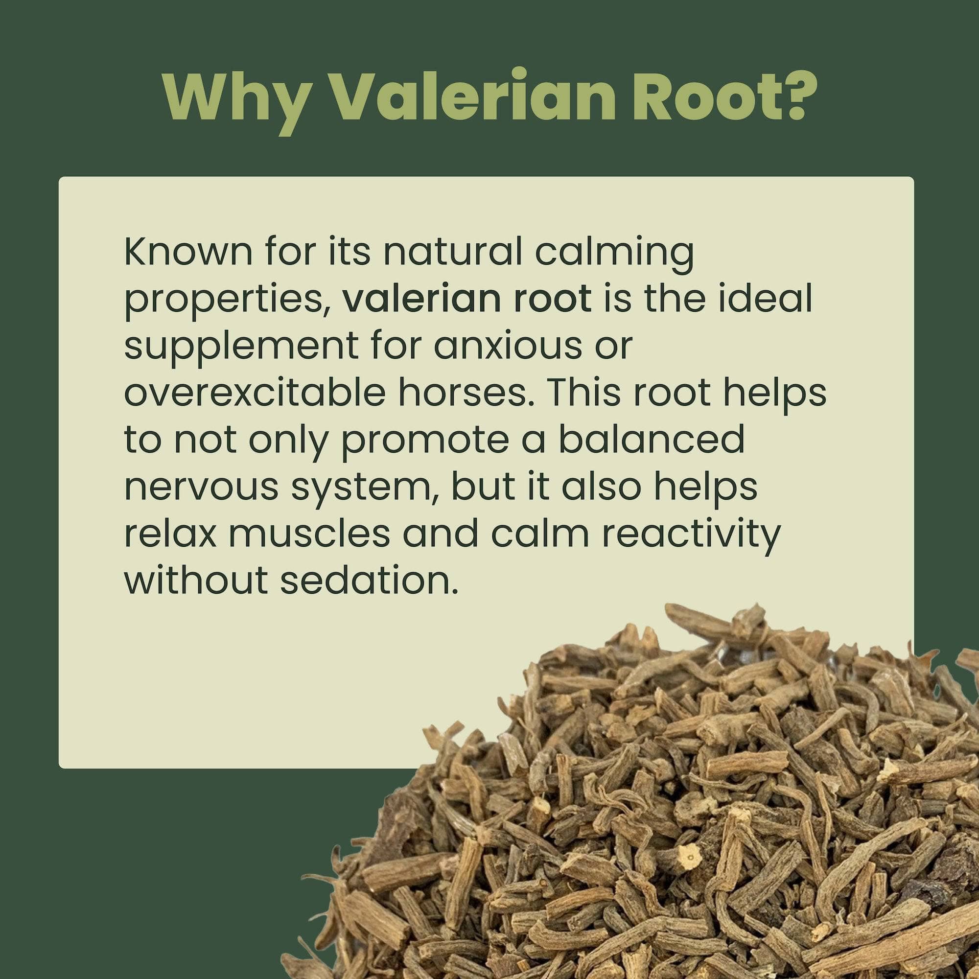 Many herbs, including Valerian Root, can be fed as an infusion, this helps the active ingredients become readily available faster and are more easily absorbed by your horse.